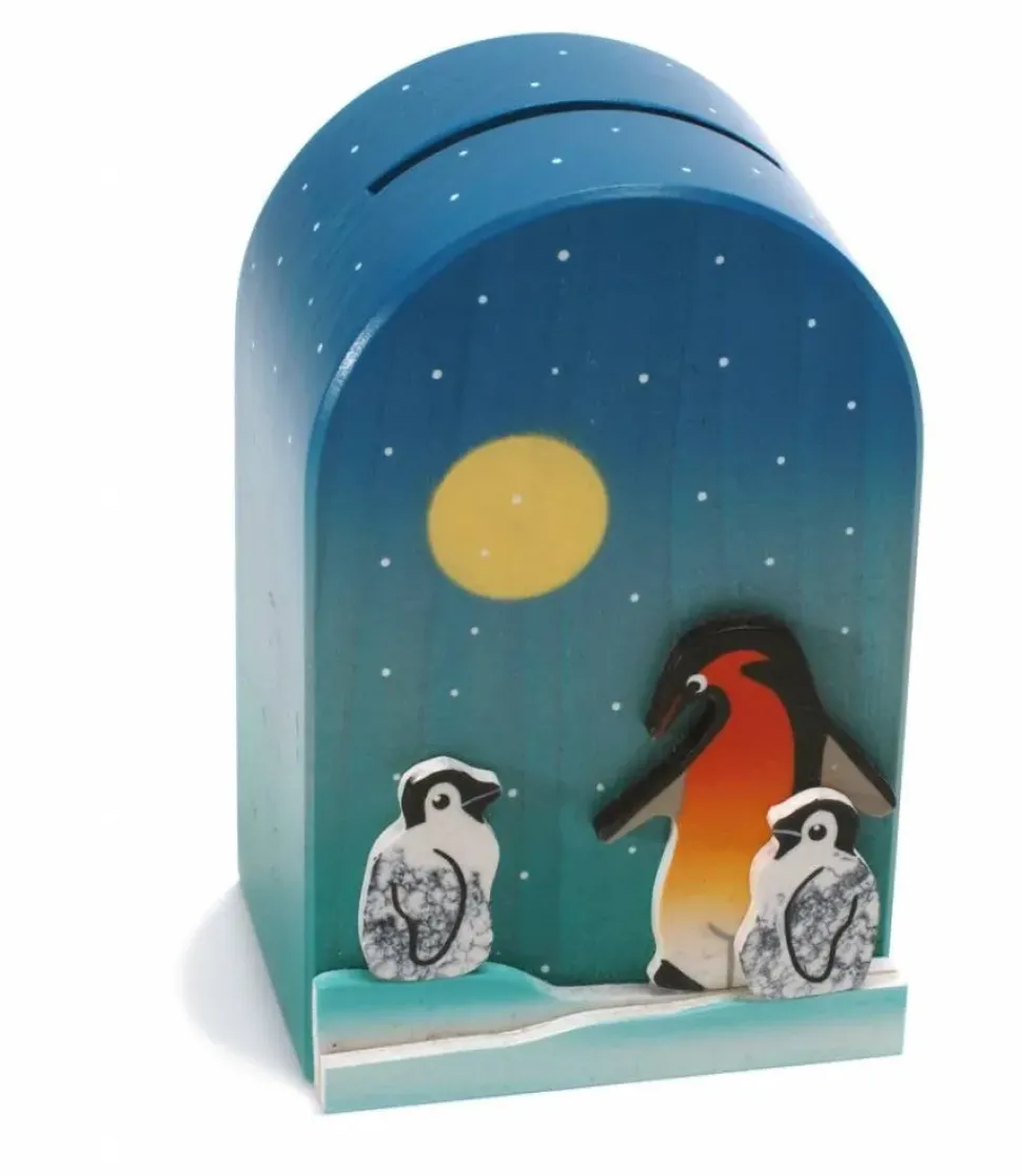 Een spaarpot van hout met daarop de Zuidpool waar een aantal pinguins op staan geschilderd. Doordat er gewerkt is met verschillende laagjes hout geeft dit een 3D effect.
