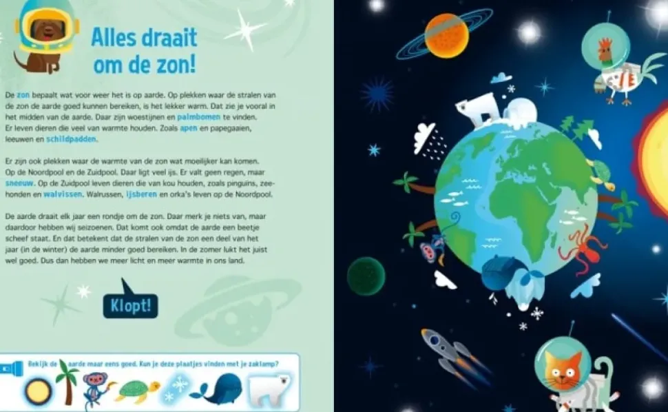 Het boek begint eerst met een educatief stuk over het onderwerp. Hier kom je ook gelijk de kartonnen zaklamp tegen. Vervolgens begint er een verhaal met dikgedrukte woorden. Deze dikgedrukte woorden staan onderaan de pagina afgebeeld.