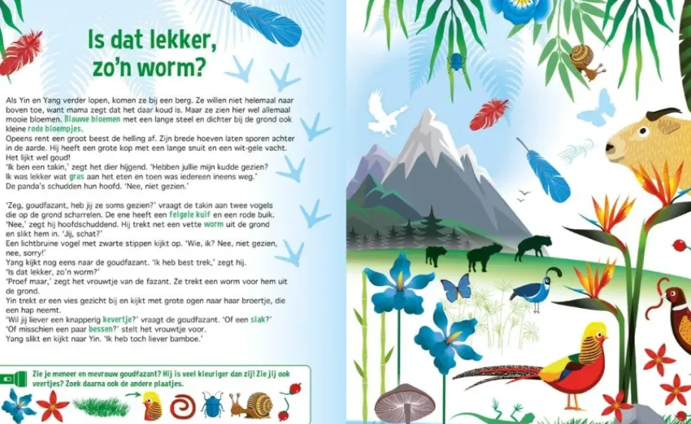 Yin en Yang zijn twee jonge reuzenpanda's die voor het eerst zelf het bos in mogen. Kom je ook kijken in het pandabos? Vrolijke voorleesverhalen met prachtige zoekplaten. Met een "zaklamp" van stevig karton. Leuke weetjes over de panda.