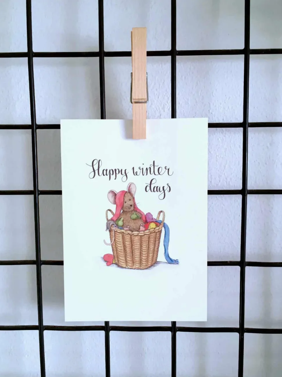 Anillustration Ansichtkaart Muisje in mand winterkleding