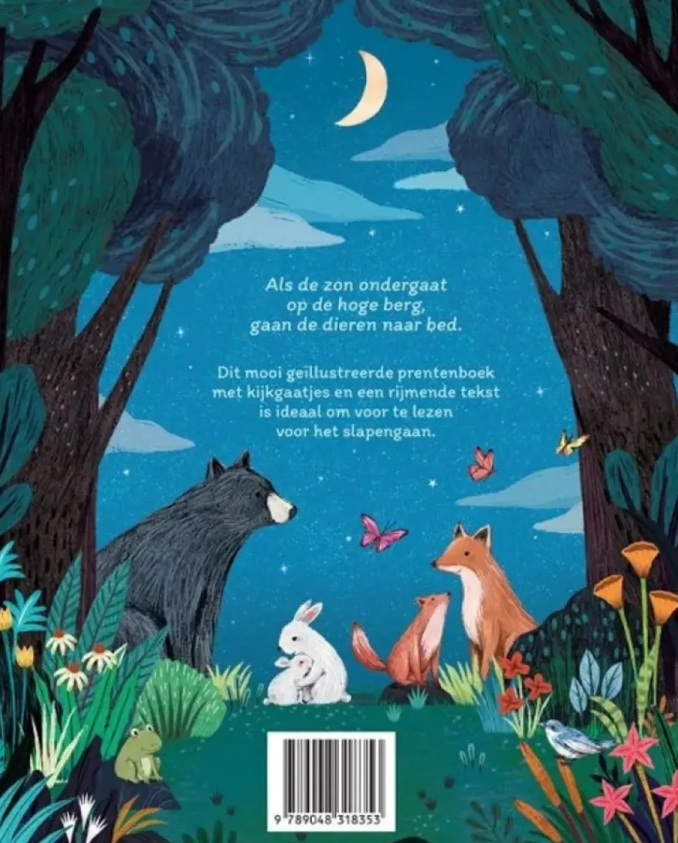 Als de zon ondergaat op de hoge berg, gaan de dieren naar bed. Dit mooi geïllustreerde prentenboek met kijkgaatjes en een rijmende tekst is ideaal om voor te lezen voor het slapengaan.