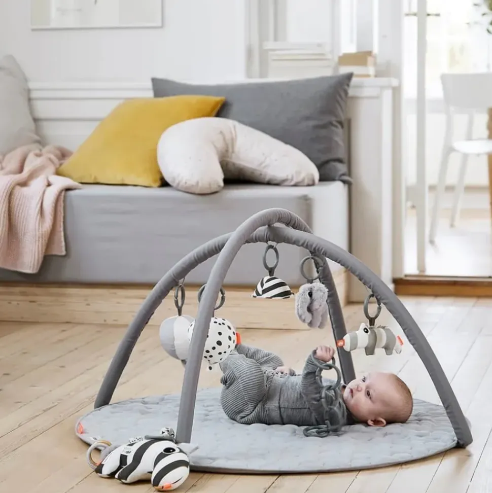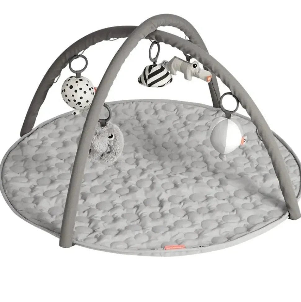 Hang het speelgoed in 13 verschillende standen aan de bogen. Croco knettert bij aanraking, Elphee rammelt, het spiegeltje glimlacht terug en de ballonnen bevatten gong en een bel – allemaal voor de stimulatie van je baby.