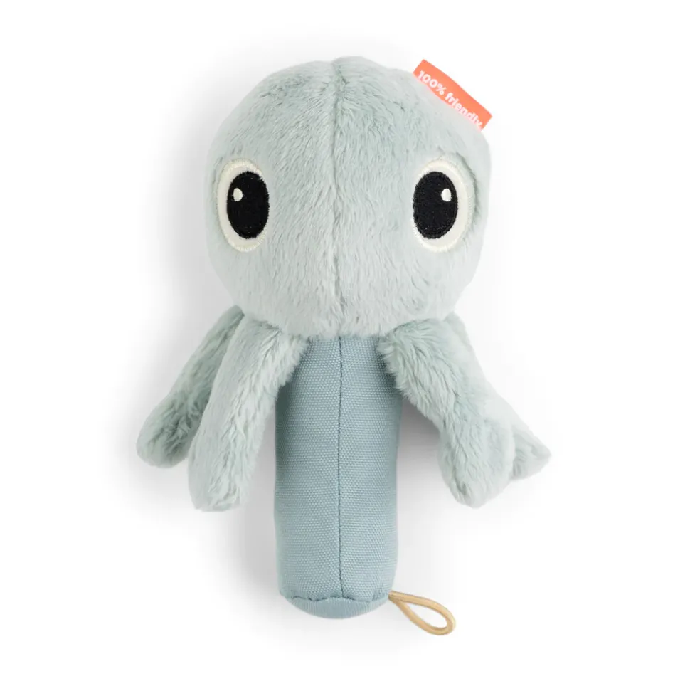 De Jelly rammelaar heeft zachte zintuiglijke poten die kreukelen wanneer nieuwsgierige kleine handjes beginnen te verkennen. Het handvat is gemakkelijk te pakken voor kleine kinderen en wanneer het wordt ingedrukt, maakt het een piepend geluid. Schud de k