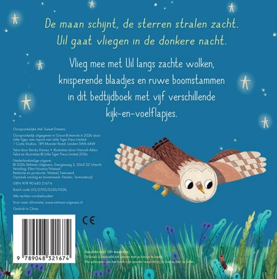 De maan schijnt, de sterren stralen zacht. Uil gaat vliegen in de donkere nacht. Vlieg mee met Uil langs zachte wolken, knisperende blaadjes en ruwe boomstammen in dit bedtijdboek met vijf verschillende kijk-en-voelflapjes.