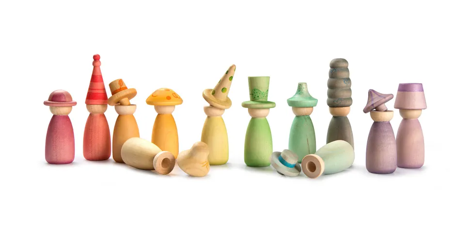 Deze set van Grapat bevat 12 Nins met de hand gekleurd in 12 kenmerkende kleuren van de regenboog met verwisselbare hoeden en lichamen om nog meer combinaties van kleurrijke mogelijkheden te bieden voor elke spelactiviteit met een open einde.