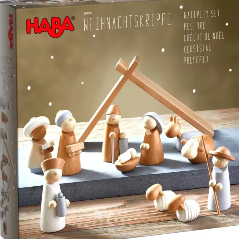 De HABA-kerststal bevat de klassieke kerstgroep van hout in een nieuwe interpretatie. De gezichten en lichamen zijn gereduceerd tot slechts enkele vormen en toch zeer expressief.