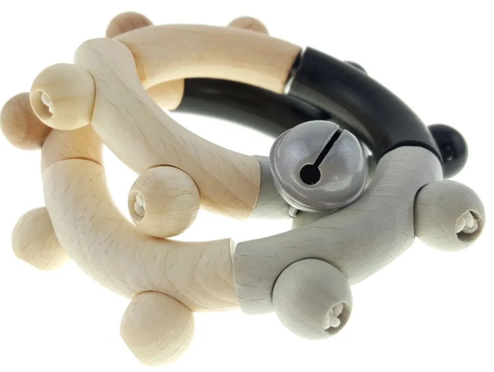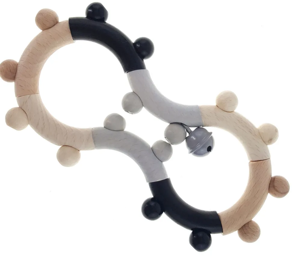 Dit grijpfiguur van Hess is hoogwaardig afgewerkt. Deze rammelaar is achtvormig en voorzien van een aantal houten balletjes en een lief belletje. Zwart en grijs gekleurd. Door de vorm gemakkelijk vast te pakken, ook voor de kleine kinderhandjes.