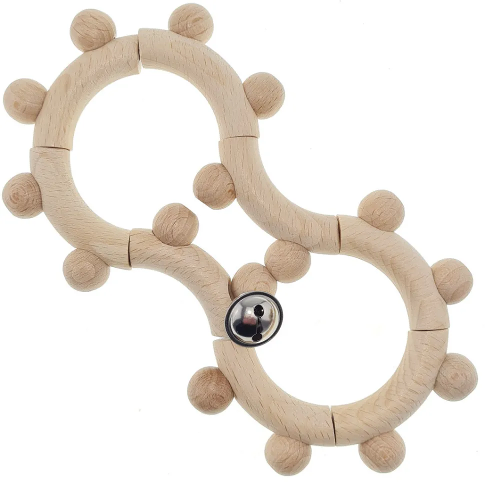 Dit grijpfiguur van Hess is hoogwaardig afgewerkt. Deze rammelaar is achtvormig en voorzien van een aantal houten balletjes en een lief belletje. Uitgevoerd in naturel. Door de vorm gemakkelijk vast te pakken, ook voor de kleine kinderhandjes.