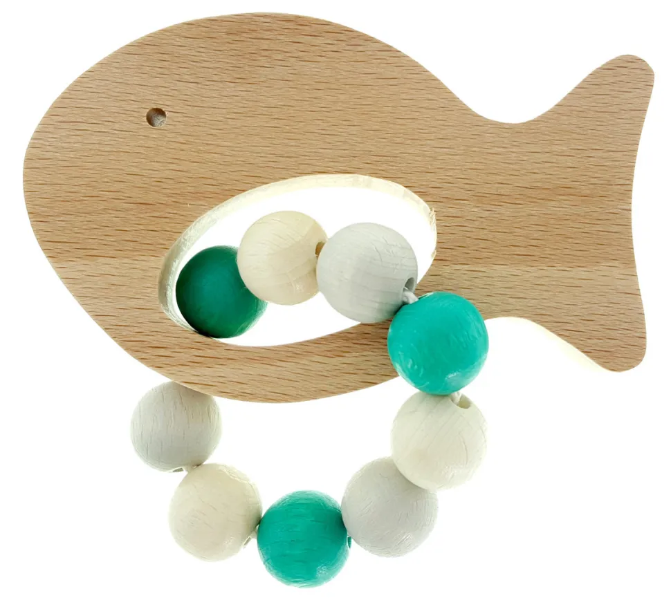 Deze grijpfiguur van Hess is hoogwaardig afgewerkt. Deze rammelaar in de vorm van een vis heeft turqoise, grijs en ecru gekleurde balletjes aan een koord, daar kunnen ze lekker mee rammelen.
