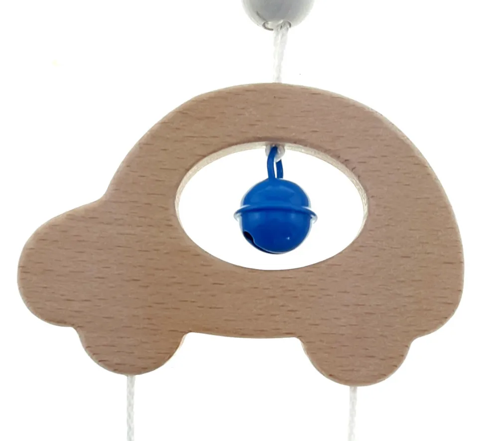 Deze mini trapeze gemaakt van beukenhout kan zo aan de kinderwagen of bedje worden vastgemaakt.