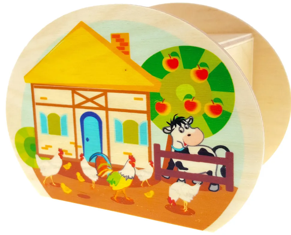 Een spaarpot die met de hand gemaakt is van hout. Deze spaarpot van Hess heeft aan beide zijden afbeeldingen van dieren die in en rond de boerderij voorkomen zoals een varken, koe en geit. Leuk om te geven of te ontvangen.