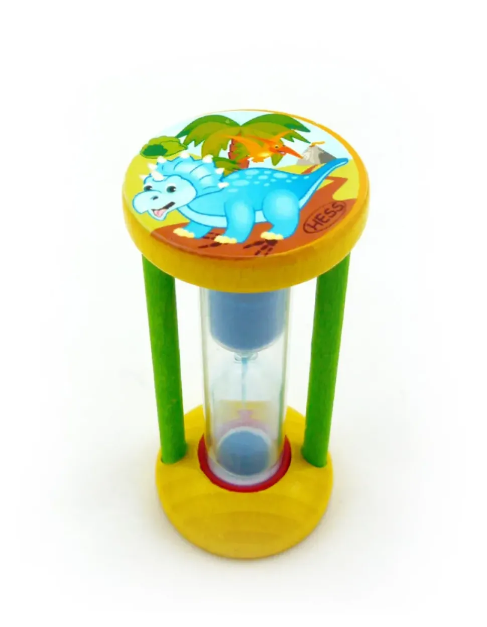 De zandloper geeft aan hoe lang je moet poetsen. Door de zandloper om te draaien begint de tijd te lopen. Deze tandenpoetsklok van Hess neemt weinig ruimte in. Aan beide zijden is een mooie afbeelding van een dino.