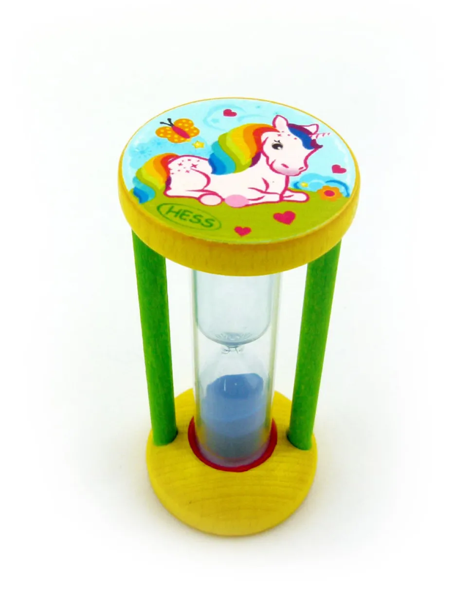 Met deze eenhoorn die een zandloper met zijn poot vasthoudt zullen de kleintjes met veel plezier hun tandjes poetsen. De zandloper geeft aan hoe lang je moet poetsen. Door de zandloper om te draaien begint de tijd te lopen.