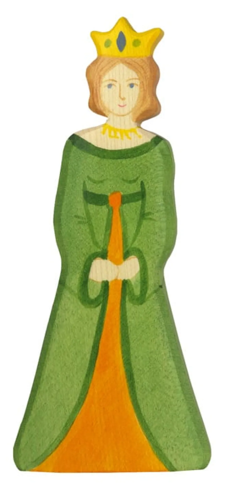 Dit is de koningin uit de serie sprookjes en ridders van Holztiger. Zij draagt een groene mantel en heeft een kroon op haar hoofd. Hoogte 16 cm.