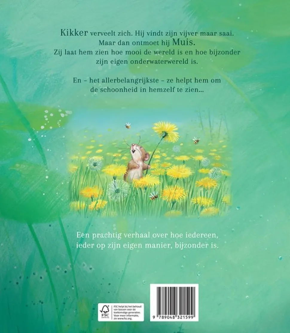 Kikker verveelt zich. Hij vindt zijn vijver maar saai. Maar dan ontmoet hij Muis. Zij laat hem zien hoe mooi de wereld is en hoe bijzonder zijn eigen onderwaterwereld is.