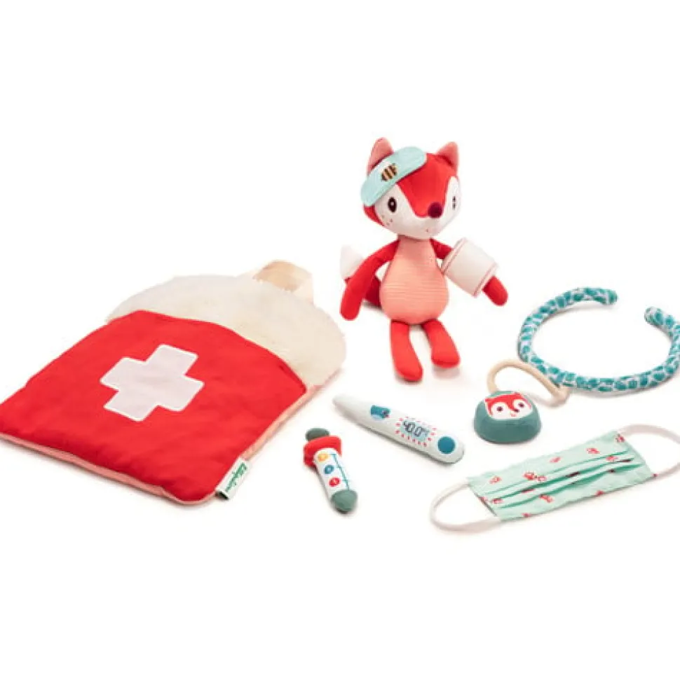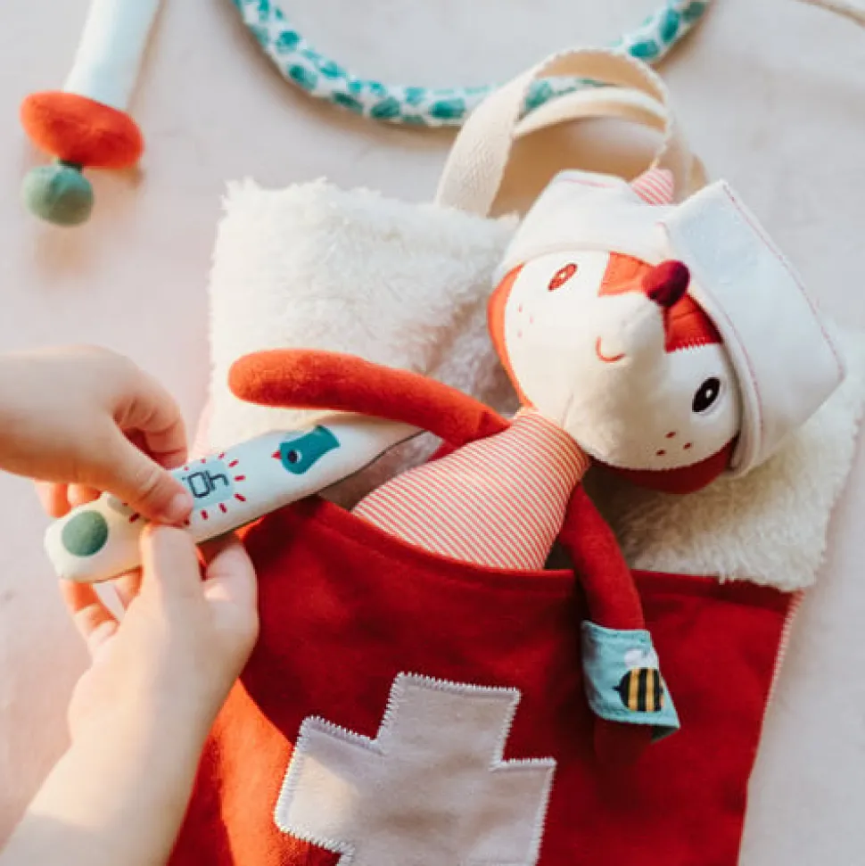 Alice het vosje voelt zich niet goed. Gelukkig komt de dokter eraan met de compleet gevulde dokterstas. De dokterstas van Lilliputiens bevat alles wat een kleine dokter nodig heeft. Het tasje kan ook dienst doen als ziekenbedje.