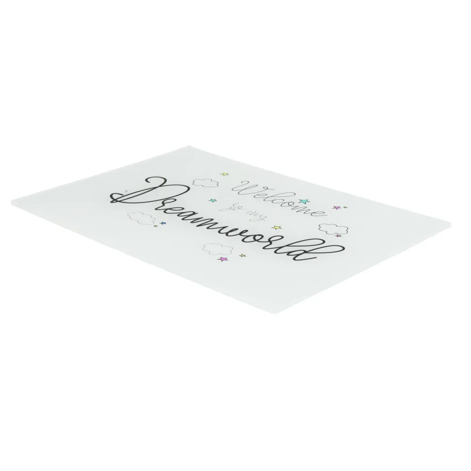 Een motief voor de rechthoekige lamp van Limundo. Op het motief staat geschreven: "Welcom to my dreamworld" . Dit motief is een acrylaat plaat die veilig is voor de kinderen doordat het veel steviger is dan glas.