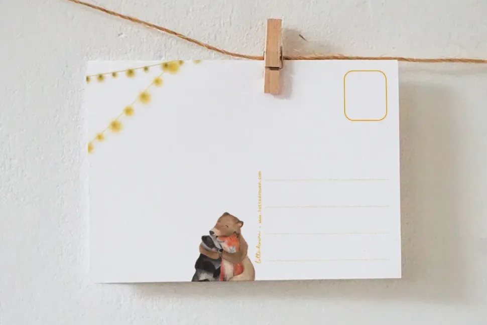 De illustratie van de kaarten van Lotte Drouen zijn door haar persoonlijk met de hand getekend en worden in kleine oplages gedrukt op mooi en dik structuurpapier. Het is zo net een klein schilderijtje. Ook de achterkant van de kaart heeft een mooi ontwerp met kleurrijke lijntjes voor de naam, adres, woonplaats en postzegel en natuurlijk ook nog een leuke illustratie.