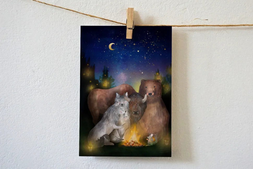 Muis Puck gaat op bezoek bij de grote drie van Europa (wolf, bizon, beer) om gezellig bij het kampvuur te zitten en te kletsen. Een betoverende illustratie die verstuurd kan worden als kaart, voor bij een cadeau of om de muur mee te versieren.