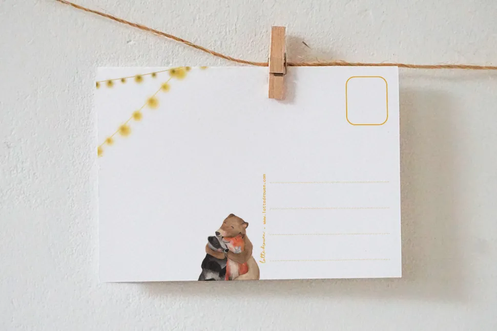 Betoverende kaart met bosdieren die lekker aan het knuffelen zijn. Een mooie orginele illustratie die verstuurd kan worden bij een feestelijke gelegenheid of bij een cadeau stoppen of als versiering aan de muur.