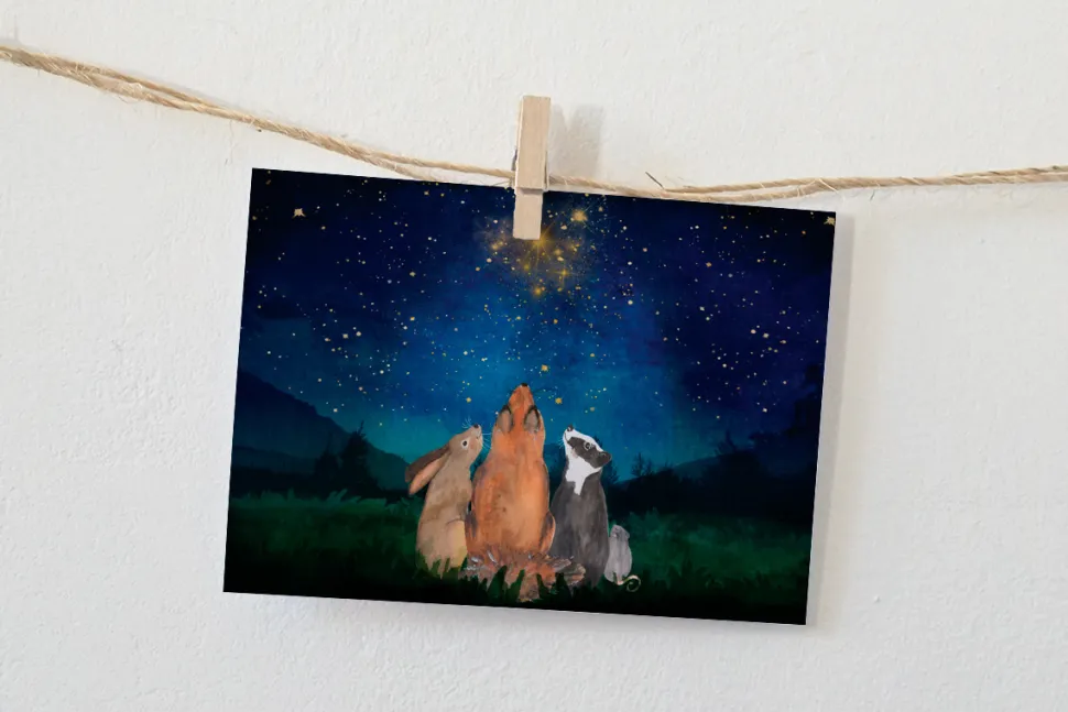 Sterren kijken! Een knusse originele illustratie die verstuurd kan worden met kerst of gewoon zomaar. Maar ook mooi voor aan de muur. Daarnaast kan je hem natuurlijk ook bij een cadeau stoppen. Altijd leuk om een kaartje te sturen of in huis op te hangen!
