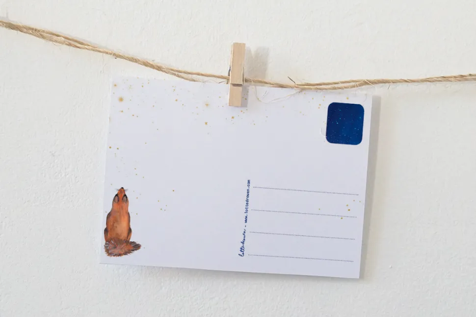 De illustratie van de kaarten van Lotte Drouen zijn door haar persoonlijk met de hand getekend en worden in kleine oplages gedrukt op mooi en dik structuurpapier. Het is zo net een klein schilderijtje. Ook de achterkant van de kaart heeft een mooi ontwerp met kleurrijke lijntjes voor de naam, adres, woonplaats en postzegel en natuurlijk ook nog een leuke illustratie.