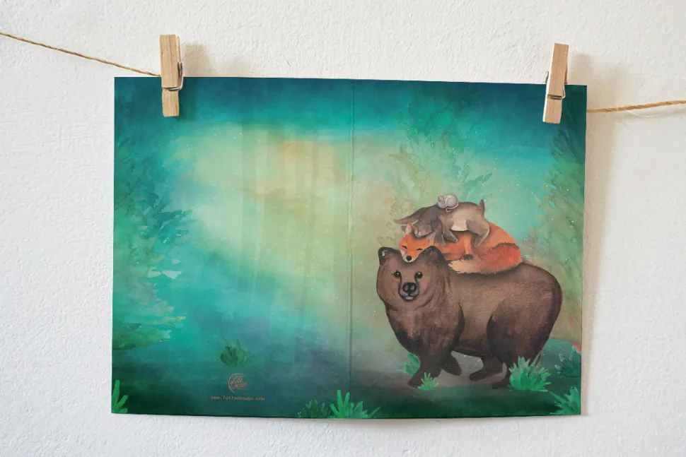 Een lieve stapel dieren in een betoverende omgeving. Een mooie wenskaart om je liefde te tonen, te laten weten dat je aan iemand denkt, de geboorte van een kleine spruit of gewoon zomaar.