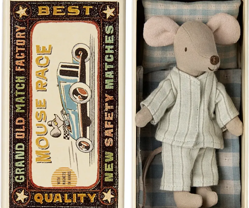 Een klassiek Maileg-item. Deze muis is klaar voor uren speelplezier en slaapt lekker weg in het kleine luciferdoosje. De kleding en het beddengoed zijn gemaakt van zachte stoffen met unieke prints in prachtige kleuren.