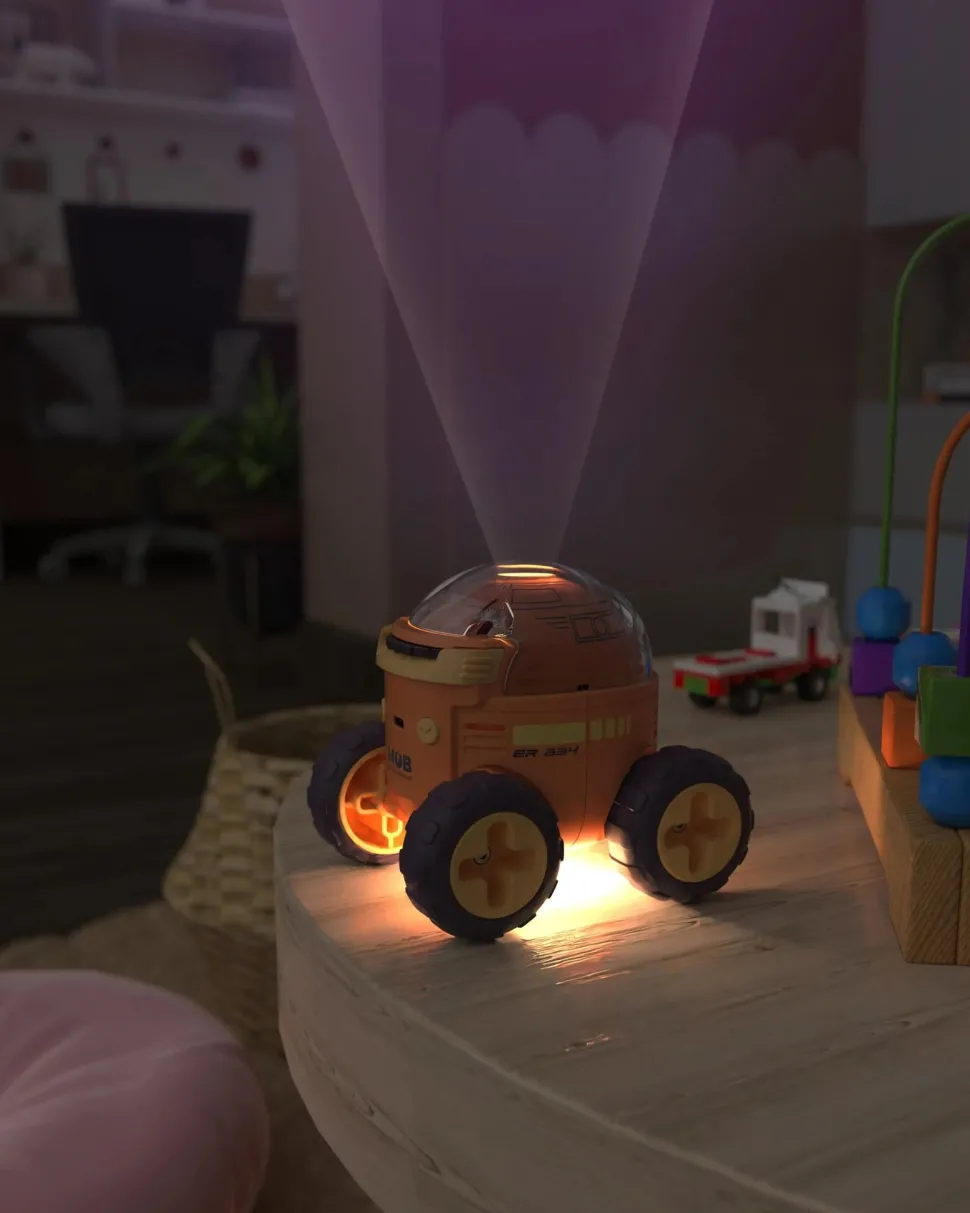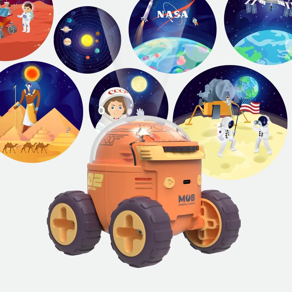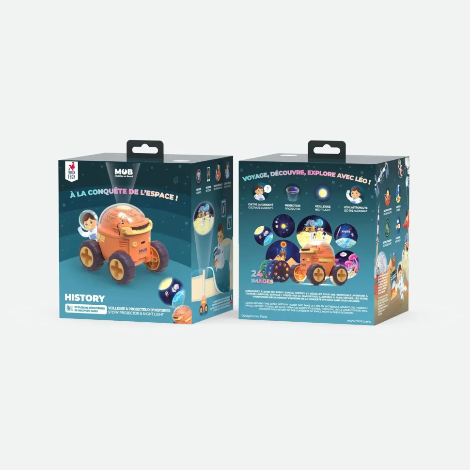 Ontdek de gloednieuwe innovatie: De HISTORY! Een kleine ruimteauto die je meeneemt naar de sterren. Jouw kind zal de ruimte en haar mysteries ontdekken met de HISTORY-rover, een nieuwe lichtprojector bestaande uit 24 geïllustreerde dia's