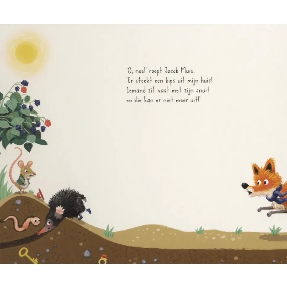 Uit het muizenhol steken billen en twee pootjes. En ze zijn niet van Muis! O-oh, Mol zit vast in het muizenhol!