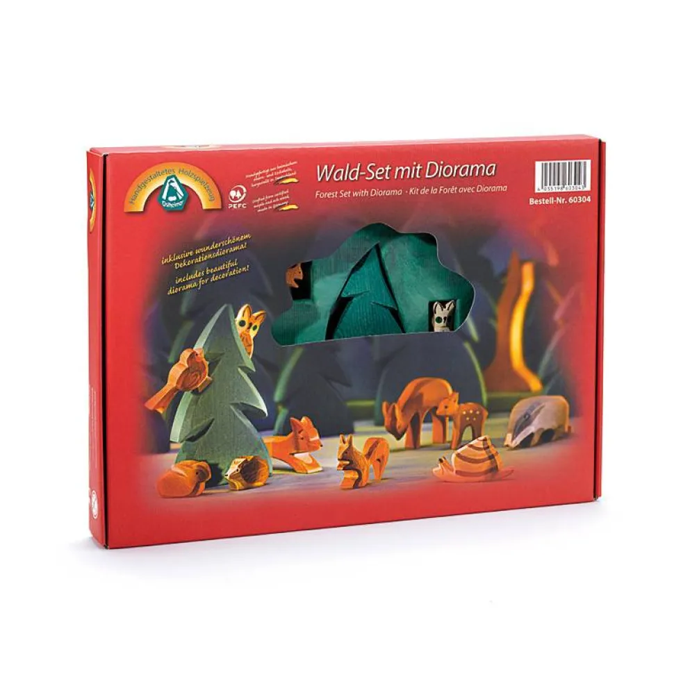 Deze 12-delige set bestaat uit de volgende Ostheimer figuren: den, ree etend, bambi, das, lopende vos, witte uil, eekhoorntje, haas, kleine egel, slak en een roodborstje. In de doos zit een diorama waar je de figuren voor kunt zetten.