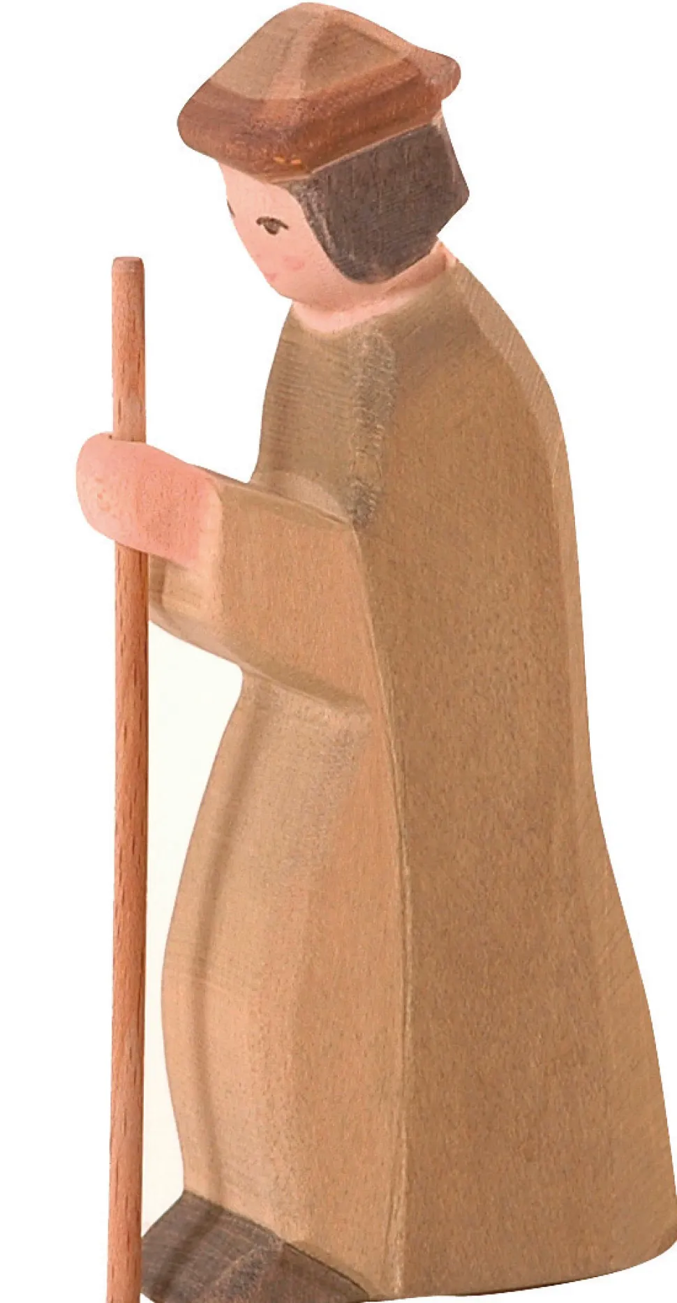 Deze met de hand van hout gemaakte herder van Ostheimer past natuurlijk in de kerststal maar in combinatie met een paar schapen en de herdersjongen ontstaat ook een mooi tafereel. De herder heeft een staf in zijn handen. Hoogte: 14.5 cm