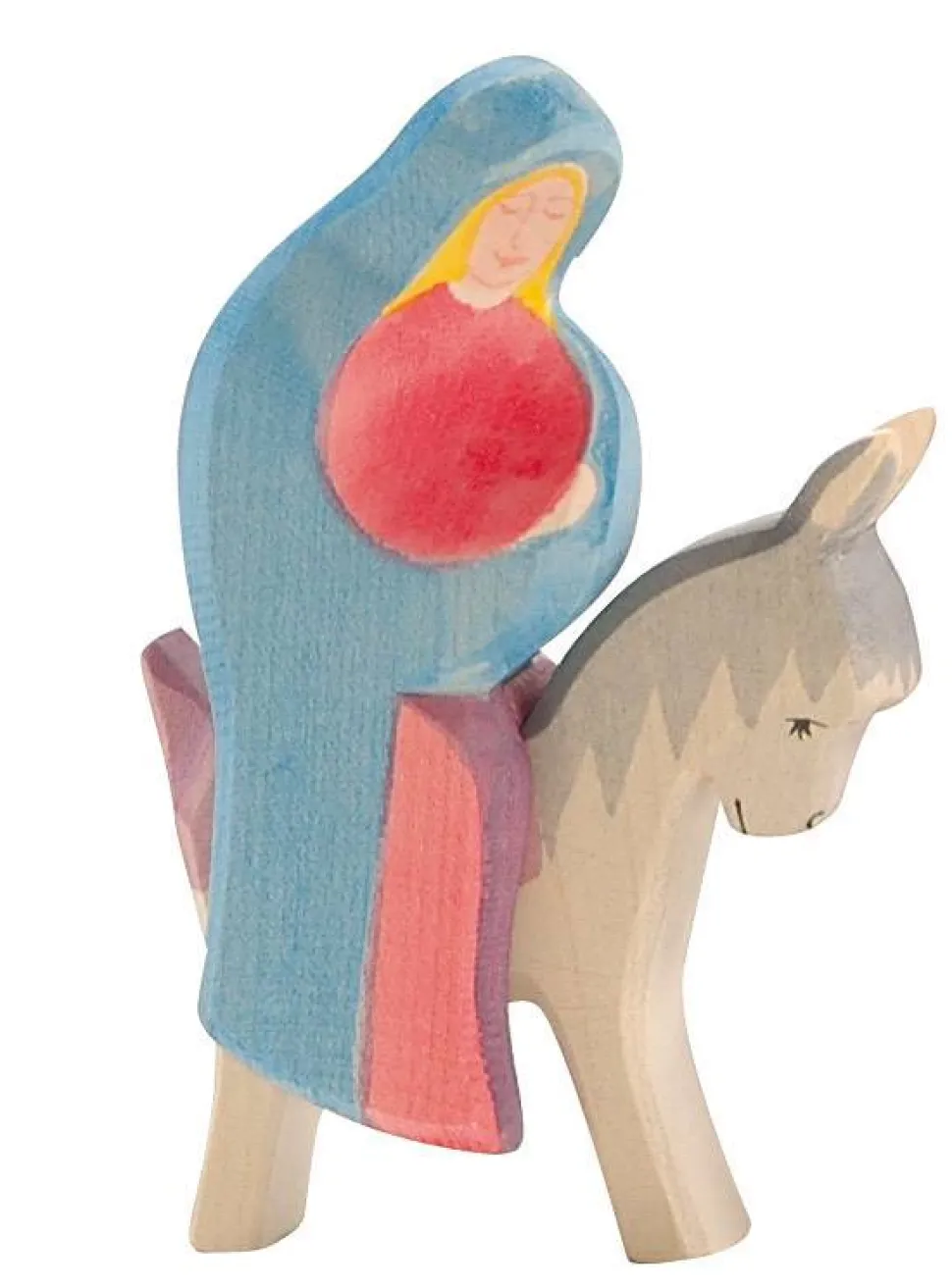 Dit is Maria zittend op haar ezel. De ezel is ook los te gebruiken. Door de speciale vorm kun je Maria niet los neerzetten maar dient ze altijd te zitten. Totale hoogte van deze 2-delige Ostheimer set: 16 cm