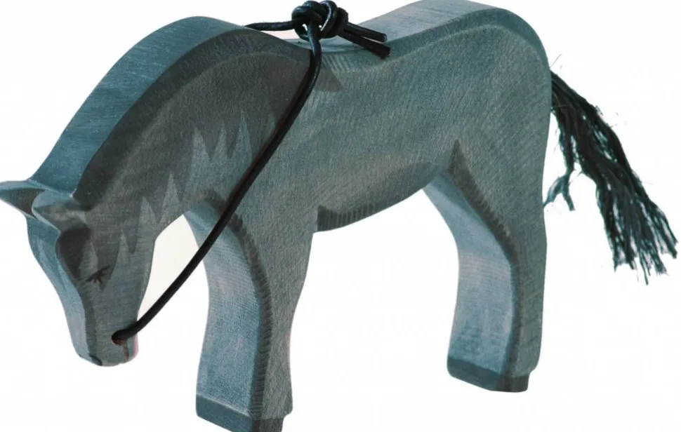 Dit zwarte paard staat naar beneden te kijken. Hoogte: 10.2 cm