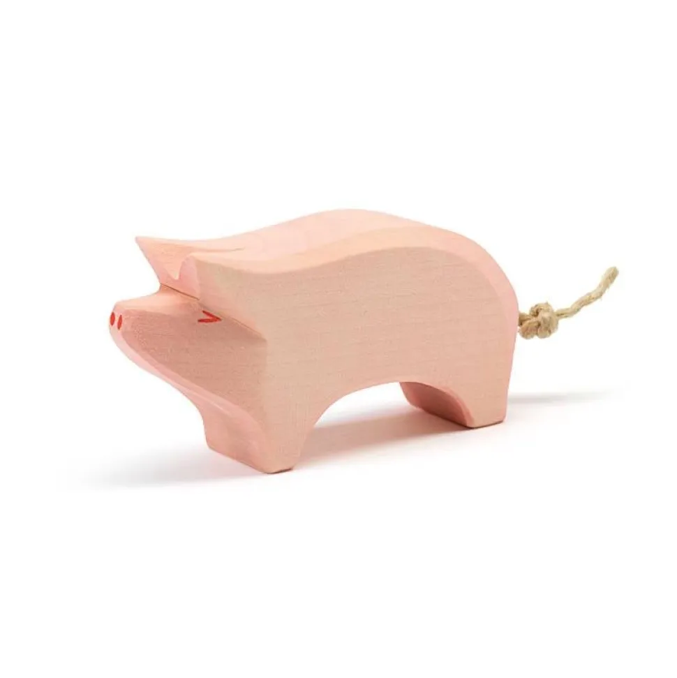 Dit met de hand en uit hout gesneden varken van Ostheimer komt uit de serie boerderijdieren. Dit varken heeft de snuit omhoog. Hoogte: 6cm
