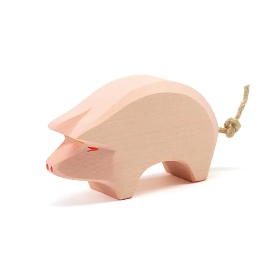 Dit met de hand en uit hout gesneden varken van Ostheimer komt uit de serie boerderijdieren. Dit varken heeft de snuit omlaag. Hoogte: 6cm.