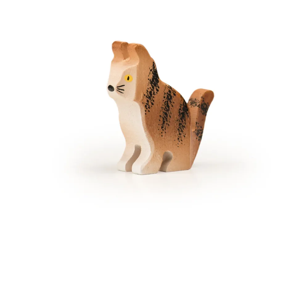 Deze kat Barney van Trauffer zit rechtop en is met de hand gemaakt van lindehout in Zwitserland, de gebruikte verf is vrij van chemicaliën. De kat is robuust genoeg om mee te spelen. Hoogte: 4.5 cm.