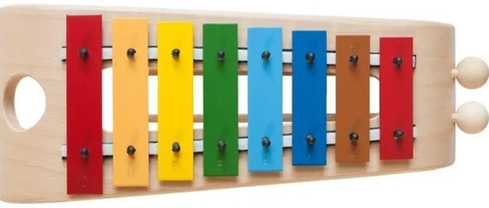 De gebogen klankbrug draagt 8 hoogwaardige kleurrijke metalen klankstaven. Zacht afgeronde randen en de wasbehandeling maken dit klokkenspel tot een echte "handvleier". De twee houten hamers kunnen gemakkelijk worden opgeborgen in de geïntegreerde houde