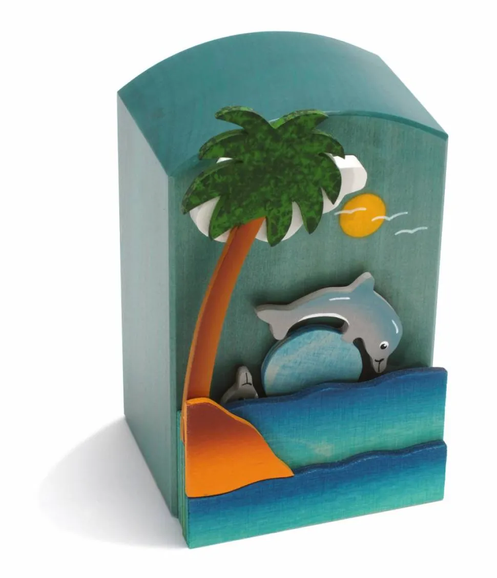 Een muziekdoosje in de vorm van een tropisch landschap met een dolfijn in de zee. Door aan de achterkant de muziekdoos op te winden en daarna aan te zetten gaan de dolfijnen draaien. Handgemaakt in Zwitersland door Weizenkorn.