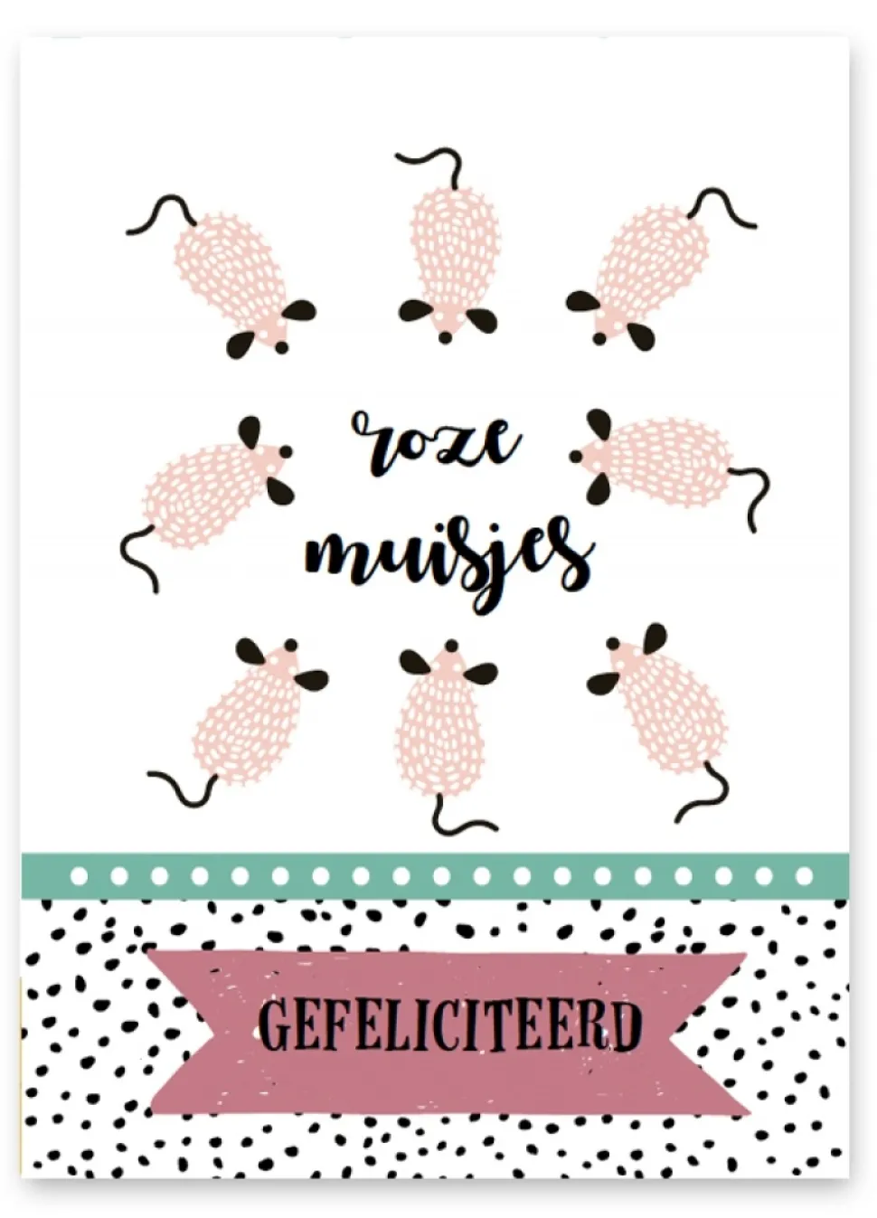 Specificaties voor: Wenskaart Roze Muisjes Gefeliciteerd