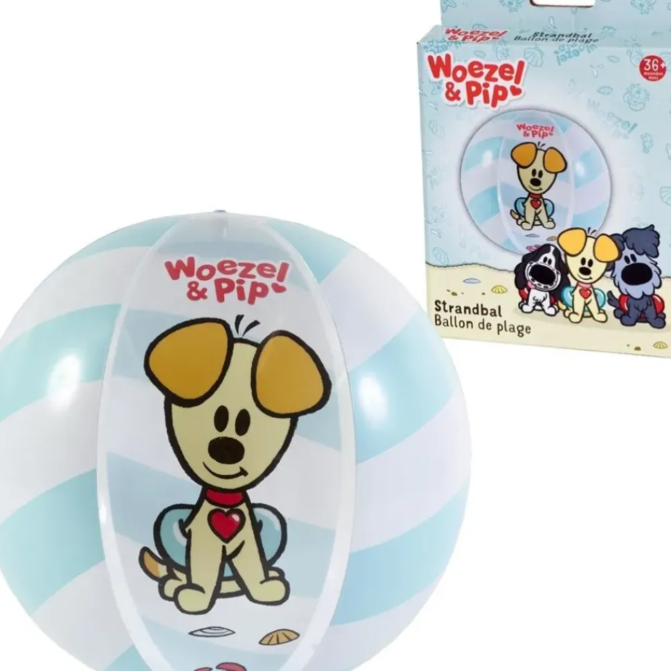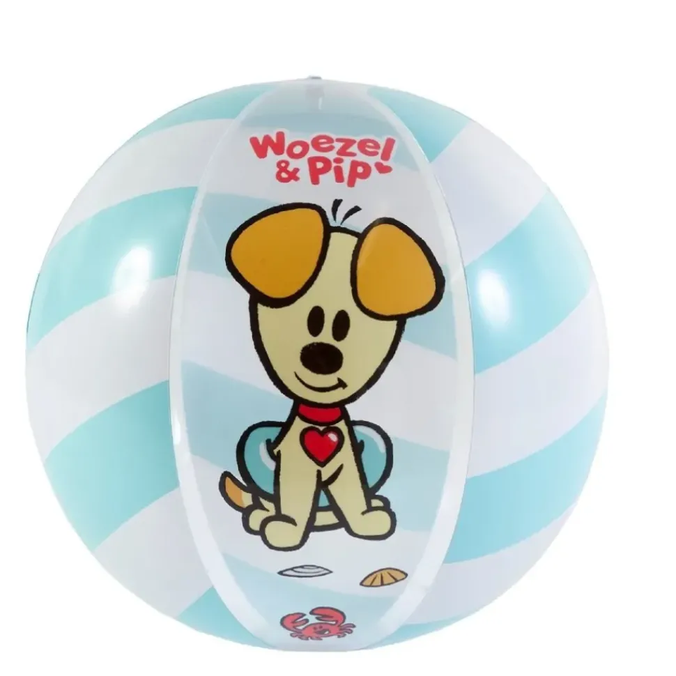 Woezel en Pip opblaas strandbal met een doorsnede van 50 cm. Aqua kleurig, met een vrolijk streep dessin en Woezel en Pip printjes. Tevens voorzien van de karakters Charlie en Buurpoes.