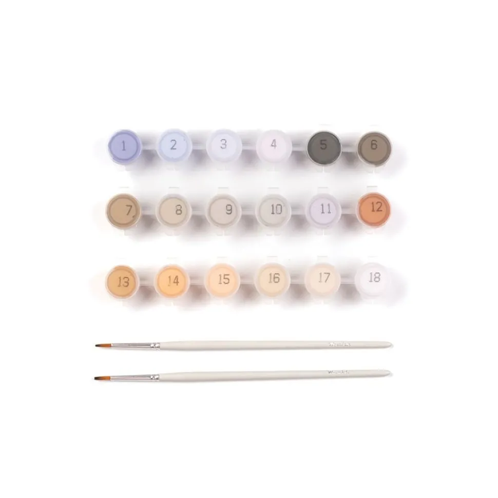 Deze paint by numbers set van Wrendale Designs bestaat uit een 40x40cm groot canvas artboard, een handleiding, 18 kleuren waterverf in gerecyclede potjes en 2 verschillende kwasten.