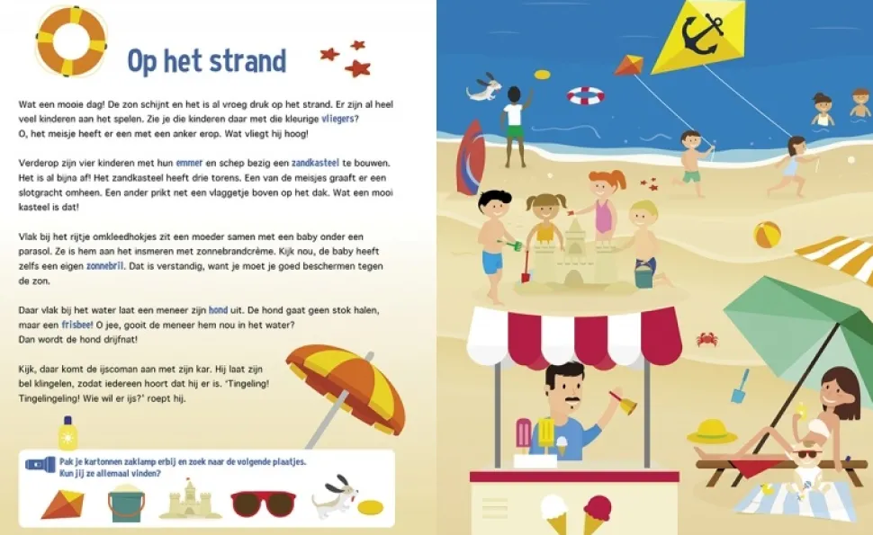 De rechterpagina is nu nog donker, maar als je de zaklamp hier achter plaatst ontstaat er een lichtbundel, net echt! Met de zaklamp kan er samen gezocht worden naar de afgebeelde dikgedrukte woorden. Zo lees je samen interactief een boek.