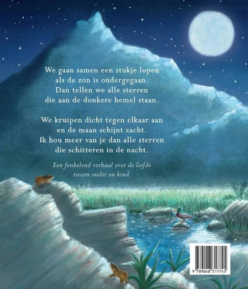 We gaan samen een stukje lopen als de zon is ondergegaan. Dan tellen we alle sterren die aan de donkere hemel staan. We kruipen dicht tegen elkaar aan en de maan schijnt zacht. Ik hou meer van je dan alle sterren die schitteren in de nacht.